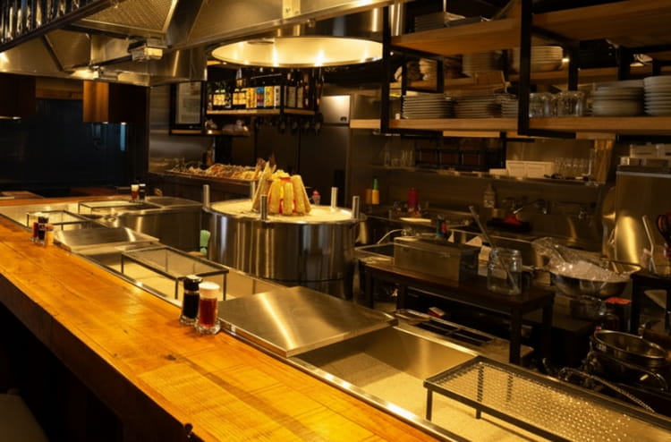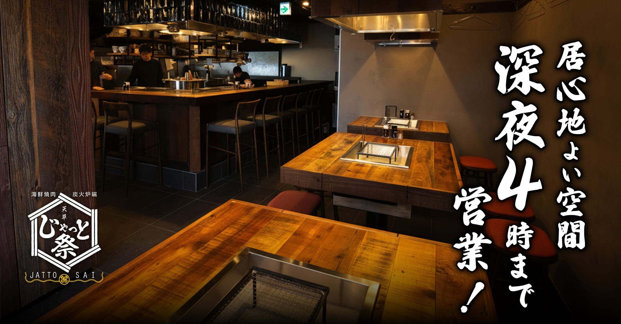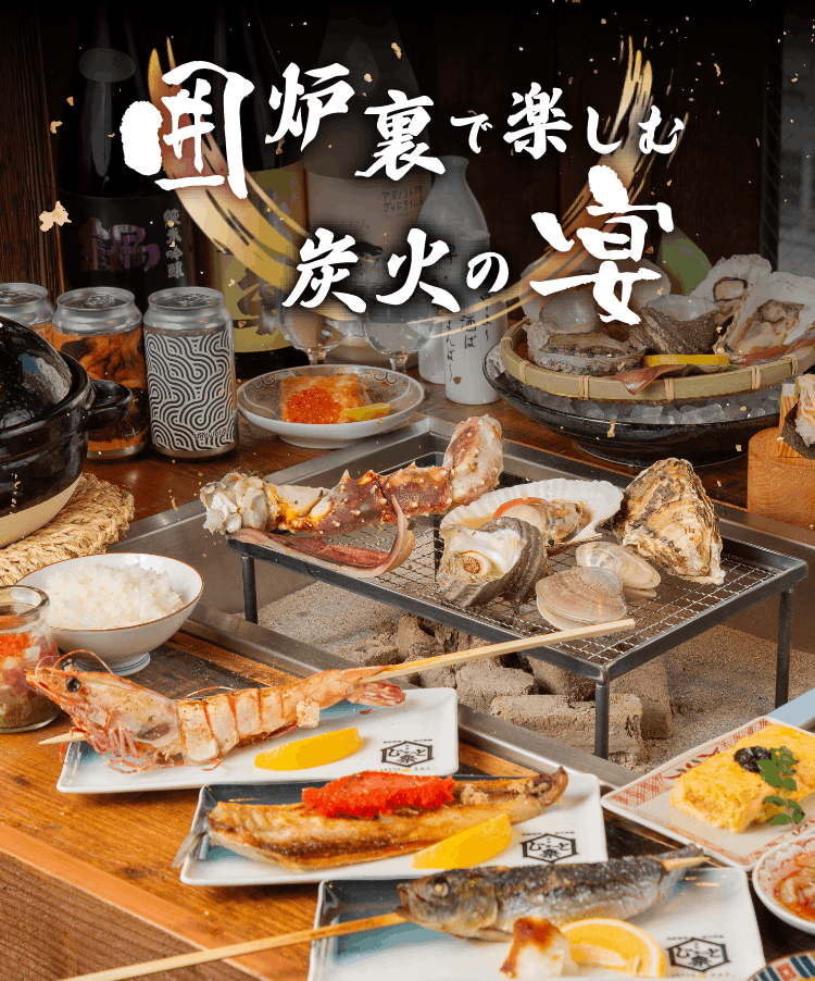全席に囲炉裏を設えた、臨場感あふれる店内。木の温もりに包まれながら、目の前の炭火と向き合うひとときを。窓際では街の景色を眺めつつ、炭がはぜる音とともにゆったりと過ごせます。中央の大囲炉裏では原始焼きが豪快に立ち上がり、焼きのライブ感を間近で体感。少人数の飲み会や仕事帰りの一杯にも最適です。深夜4:00まで営業、時間を気にせず炭火の夜をお楽しみください。