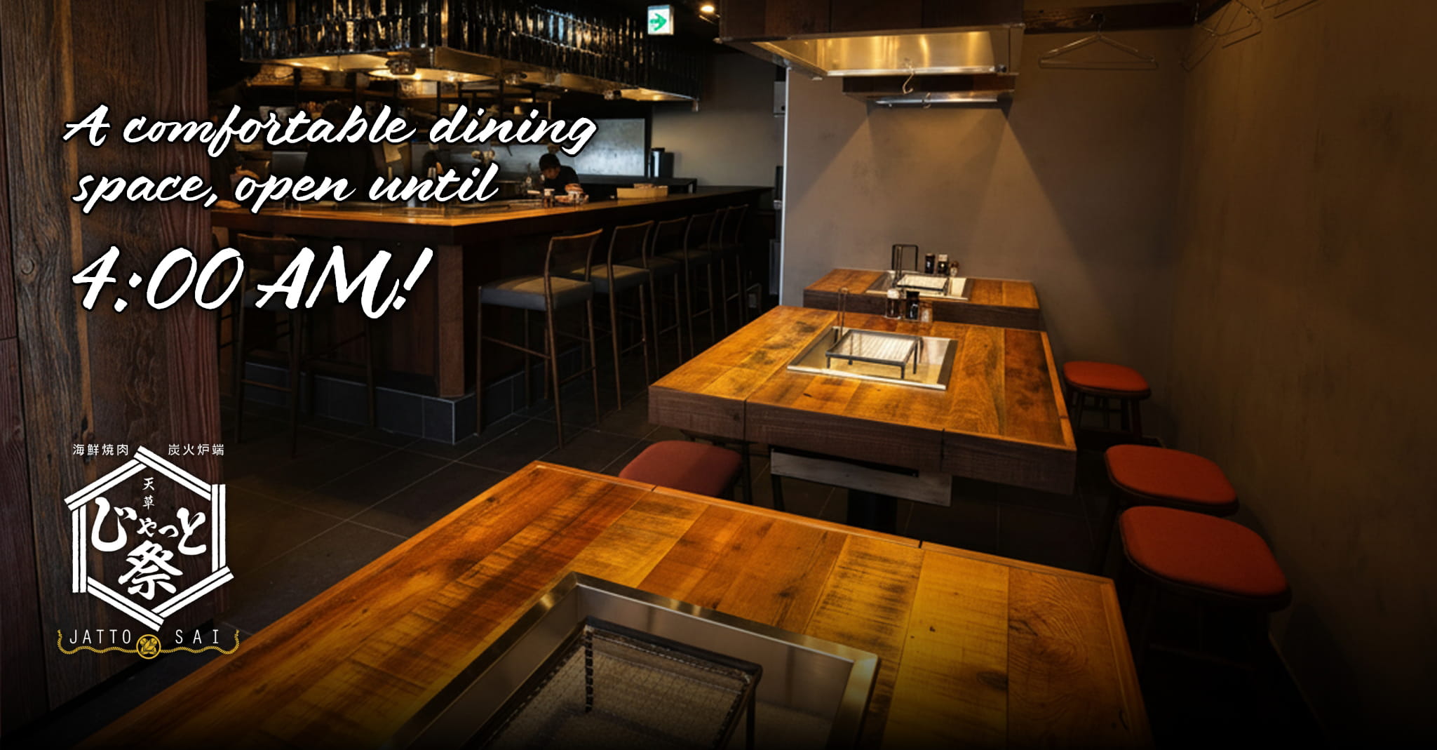 Located in Shinsaibashi, Osaka, “Seafood Yakiniku Jatto Sai” is a seafood izakaya where every seat features a traditional irori hearth, allowing guests to grill fresh seafood themselves. Enjoy hama-yaki and genshi-yaki together with freshly pressed Japanese sake for an immersive and lively dining experience.